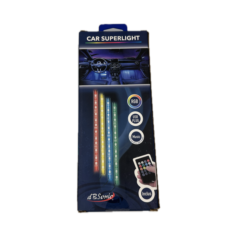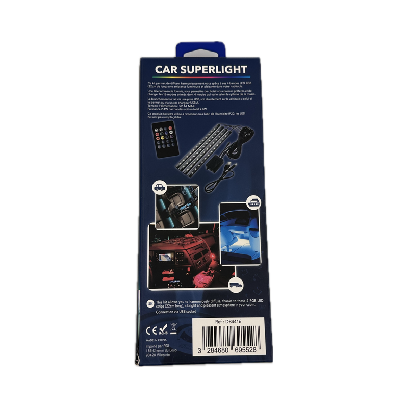 Ce kit permet de diffuser harmonieusement, et ce grâce à ses 4 bandes LED RGB (22 cm de long) une ambiance et plaisante dans votre habitacle.